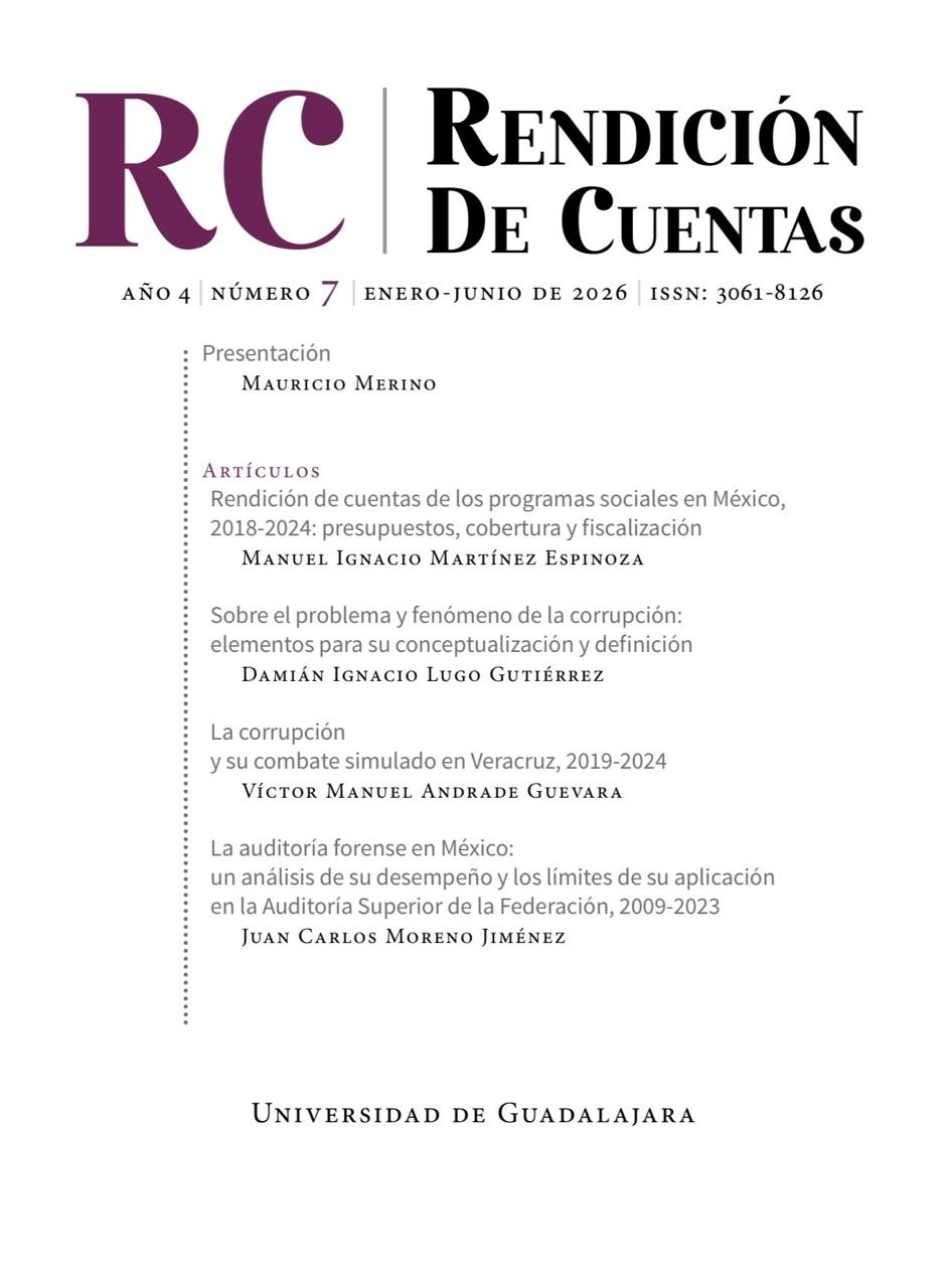 Núm. 7 (2026)RC Rendición de Cuentas, Año 4, No.7, enero-junio de 2026 es una publicación semestral editada por la Universidad de Guadalajara, a través del Instituto de Investigación en Rendición de Cuentas y Combate a la Corrupción del Departamento de Políticas Públicas, Centro Universitario de Ciencias Económico Administrativas, Periférico Norte 799, módulo P, Segundo Piso, Núcleo Los Belenes, C.P. 45100, Zapopan, Jalisco, México, teléfono (33) 3770 3300, correo: rc.rendiciondecuentas@gmail.com, Editora responsable: Marcela Rubí Aguilar Arévalo, Director de la revista: Mauricio Merino Huerta, Reserva de derechos al uso exclusivo del título 04-2022-111714561500-102, ISSN-E: 2992-7935, otorgados por el Instituto Nacional del Derecho de Autor. Responsable de la última actualización de éste número: Instituto de Investigación en Rendición de Cuentas y Combate a la Corrupción, CUCEA, Periférico Norte 799, Núcleo Los Belenes, C.P. 45100, Zapopan, Jalisco, México, Marcela Rubí Aguilar Arévalo al 31 de enero de 2026.